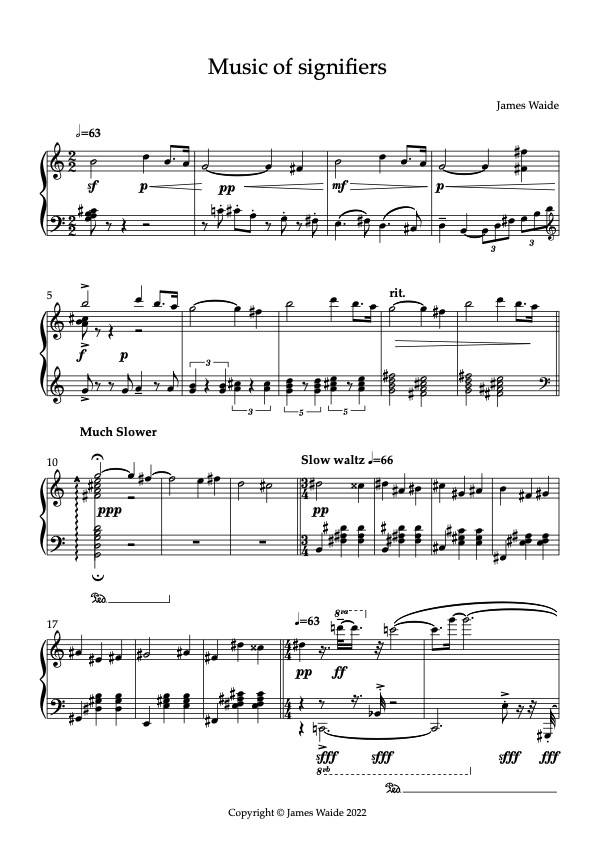 Take my most recent effort, entitled Music of Signifiers [score provided below]. A musing on a theme from Bruckner’s 5th symphony (this theme itself very reminiscent of Jack White’s guitar riff from Seven Nation Army) bleeds straight into a short, tonally adventurous waltz, which then moves directly into an extended section of music made using random number generation alongside Messiaen’s Mode de valeurs et d’intensités. Some may question why these fragments belong together, or what meaning they have when placed together, but I am simply not interested in answering these questions, at least not yet. These are signifiers which have been unexpectedly juxtaposed, whatever is the signified which emerges (or which I want to emerge) might take time now to form, but in the meantime I am happy for these signifiers to hang out, to grow acquainted with each other, to form their own relationships.